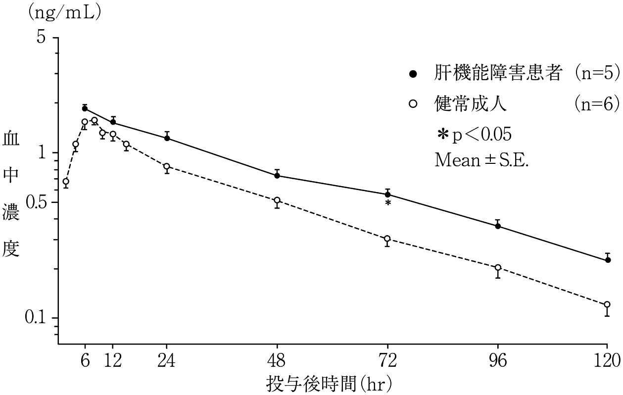 成人肝硬変患者(Child分類A、B)5例にアムロジピンとして2.5mgを単回投与した場合の血中濃度推移並びに薬物動態パラメータは図及び表の通りである。健康成人に比し、投与72時間後の血中濃度が有意に上昇し、T1/2、AUCはやや高値を示したが有意差は認められなかった13) 。