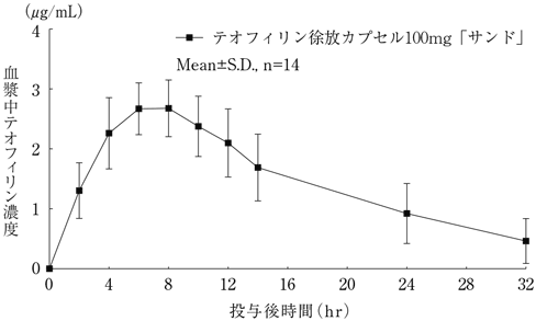 テオフィリン徐放カプセル100mg「サンド」を健康成人14名に臨床量に従い2カプセル(テオフィリン200mg)空腹時経口投与し、投与後32時間までの血中濃度をHPLC法により測定した2)。