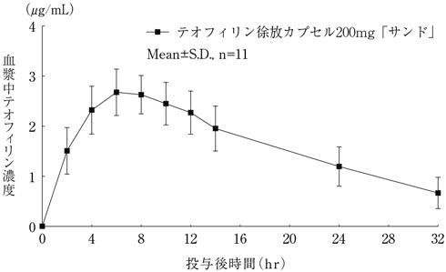 テオフィリン徐放カプセル200mg「サンド」を健康成人11名に臨床量に従い1カプセル(テオフィリン200mg)空腹時経口投与し、投与後32時間までの血中濃度をHPLC法により測定した3)。