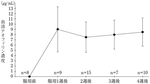テオフィリンの治療上有効な血清中濃度は5~20μg/mLであり、20μg/mLを超えると中毒作用が発現することがある11)。