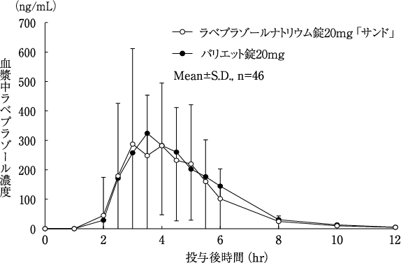 ラベプラゾールナトリウム錠20mg「サンド」とパリエット錠20mgを、クロスオーバー法によりそれぞれ1錠(ラベプラゾールナトリウム20mg)健康成人男子に絶食単回経口投与して血漿中未変化体濃度を測定し、得られた薬物動態パラメータ(AUC、Cmax)について90%信頼区間法にて統計解析を行った結果、log(0.8)~log(1.25)の範囲内であり、両剤の生物学的同等性が確認された3)。