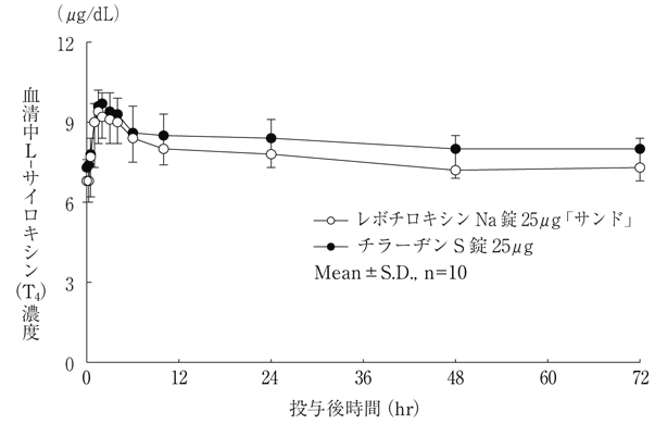 レボチロキシンNa錠25μg「サンド」又はレボチロキシンNa錠50μg「サンド」とチラーヂンS錠25μg又はチラーヂンS錠50μgを、並行群間比較試験法によりそれぞれ8錠又は4錠(レボチロキシンナトリウム200μg)健康成人男子に絶食単回経口投与して血清中L-サイロキシン(T4)濃度を測定し、得られた薬物動態パラメータ(AUC、Cmax)について90%信頼区間法にて統計解析を行った結果、log(0.8)~log(1.25)の範囲内であり、両剤の生物学的同等性が確認された9)。