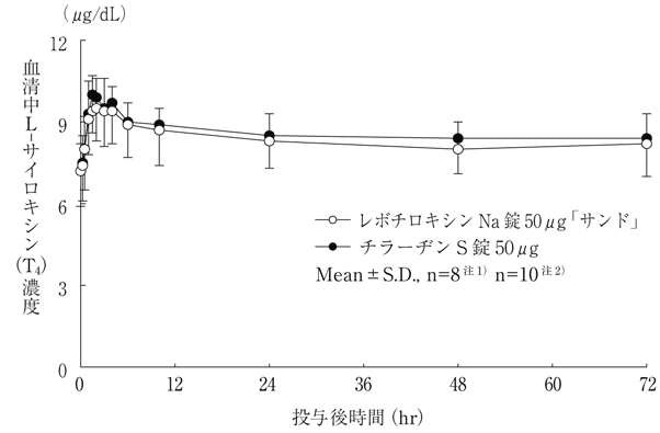 注1)レボチロキシンNa錠50μg「サンド」投与群注2)チラーヂンS錠50μg投与群血清中濃度並びにAUC、Cmax等のパラメータは、被験者の選択、体液の採取回数・時間等の試験条件によって異なる可能性がある。