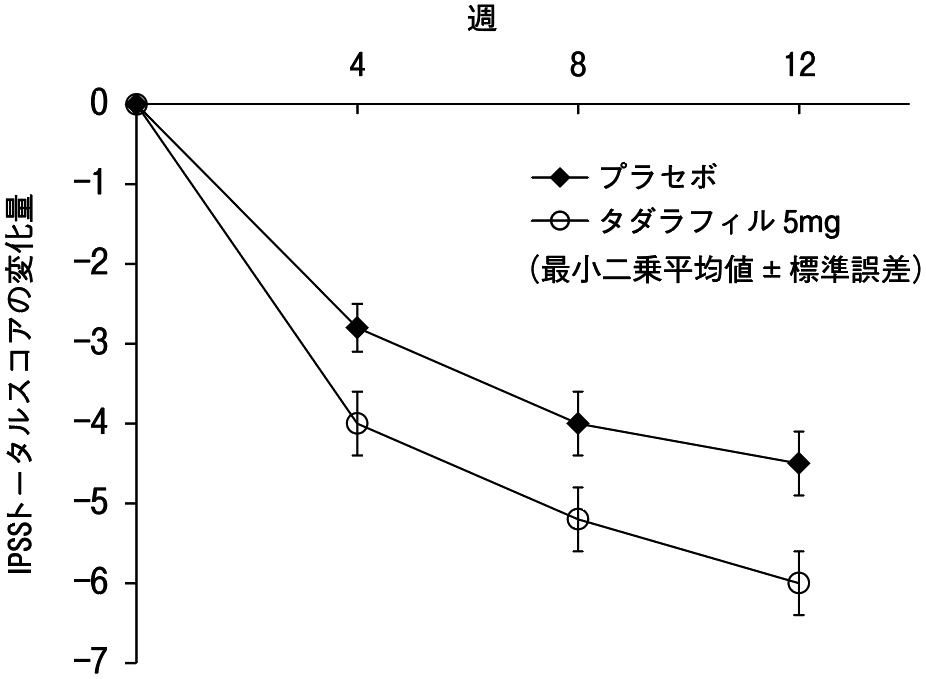 第II相試験を完了した394例の被験者が42週の長期投与非盲検試験に参加した。前立腺肥大症に伴う排尿障害患者にタダラフィル5mgを1日1回54週間(二重盲検期間12週を含む)長期継続投与した結果、IPSSトータルスコアの継続的な改善の維持が認められ、長期の安全性及び良好な忍容性が確認された41) 。副作用発現頻度は、タダラフィル5mg群で10.7%(42/394例)であった。主な副作用は、消化不良及び胃食道逆流性疾患が各1.3%(5/394例)であった。