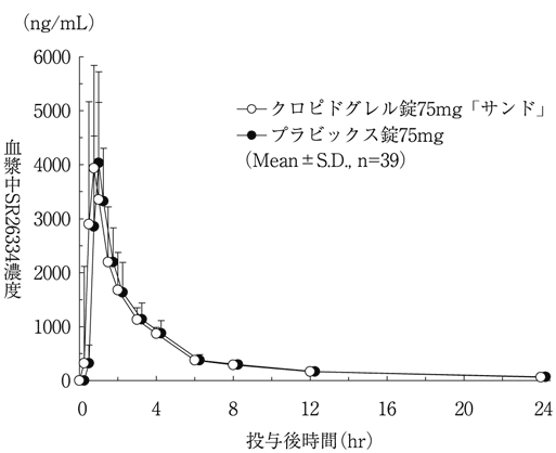 健康成人にクロピドグレル硫酸塩(クロピドグレルとして75mg)を食後に単回経口投与した場合のSR26334(主代謝物)の薬物動態パラメータは以下のとおりである10)。