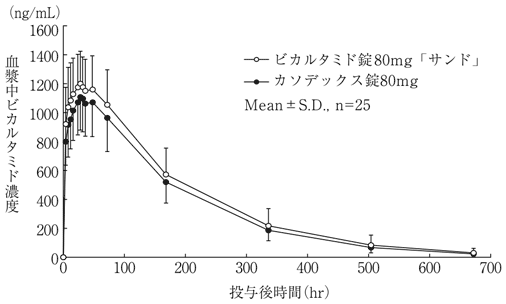 ビカルタミド錠80mg「サンド」とカソデックス錠80mgを、並行群間比較試験法によりそれぞれ1錠(ビカルタミド80mg)健康成人男子に絶食単回経口投与して血漿中未変化体濃度を測定し、得られた薬物動態パラメータ(AUC、Cmax)について90%信頼区間法にて統計解析を行った結果、log(0.8)~log(1.25)の範囲内であり、両剤の生物学的同等性が確認された4)。