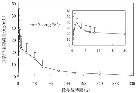 閉経後健康女性(12例)にレトロゾール2.5mgを空腹時に単回経口投与したとき、血漿中濃度は以下のように推移した2)。