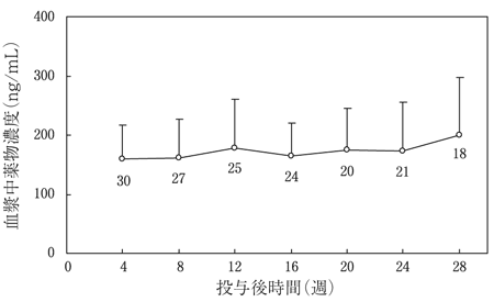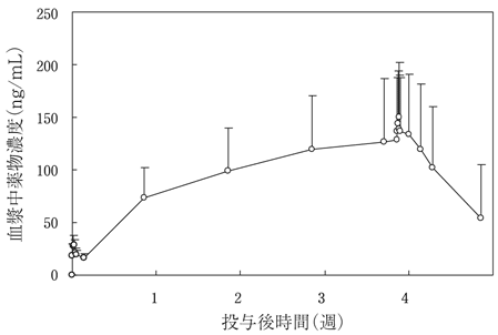 閉経後健康女性(10例)に、レトロゾール2.5mgを1日1回、反復投与したときの血漿中薬物濃度は、投与回数が増えるにしたがって徐々に上昇し、投与4週間でほぼ一定値に近づいた。初回投与に対する4週後投与のAUC0-24比(累積係数)は7.2であった3)。また、閉経後乳癌女性患者(31例)にレトロゾール2.5mgを1日1回反復経口投与したときの血漿中トラフ濃度は、投与4週目以降ほぼ一定値で推移し、定常状態であると考えられた4)。