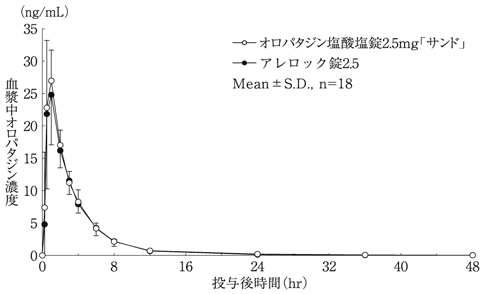 オロパタジン塩酸塩錠2.5mg「サンド」とアレロック錠2.5を、クロスオーバー法によりそれぞれ1錠(オロパタジン塩酸塩として2.5mg)健康成人男性に絶食下単回経口投与して血漿中未変化体濃度を測定した。得られた未変化体の薬物動態パラメータ(AUCt、Cmax)について90%信頼区間法にて統計解析を行った結果、log(0.80)~log(1.25)の範囲内であり、両剤の生物学的同等性が確認された3)。