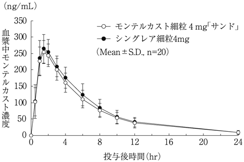 モンテルカスト細粒4mg「サンド」とシングレア細粒4mgを、クロスオーバー法によりそれぞれ1包(モンテルカストとして4mg)健康成人男性に絶食下単回経口投与して血漿中モンテルカスト濃度を測定した。得られたモンテルカストの薬物動態パラメータ(AUC、Cmax)について90%信頼区間法にて統計解析を行った結果、log(0.80)~log(1.25)の範囲内であり、両剤の生物学的同等性が確認された10)。
