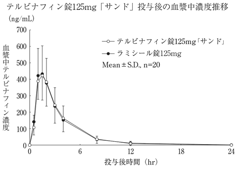 テルビナフィン錠125mg「サンド」とラミシール錠125mgを、クロスオーバー法によりそれぞれ1錠(テルビナフィンとして125mg)健康成人男子に絶食単回経口投与して血漿中未変化体濃度を測定し、得られた薬物動態パラメータ(AUC、Cmax)について90%信頼区間法にて統計解析を行った結果、log(0.8)~log(1.25)の範囲内であり、両剤の生物学的同等性が確認された2)。