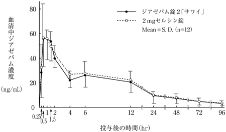 ジアゼパム錠2「サワイ」と2mgセルシン錠を健康成人男子にそれぞれ1錠(ジアゼパムとして2mg)空腹時単回経口投与(クロスオーバー法)し、血清中ジアゼパム濃度を測定した。得られた薬物動態パラメータ(AUC、Cmax)について統計解析を行った結果、両剤の生物学的同等性が確認された1) 。