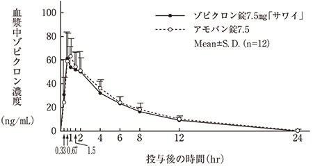 ゾピクロン錠7.5mg「サワイ」とアモバン錠7.5を健康成人男子にそれぞれ1錠(ゾピクロンとして7.5mg)空腹時単回経口投与(クロスオーバー法)し、血漿中ゾピクロン濃度を測定した。得られた薬物動態パラメータ(AUC、Cmax)について統計解析を行った結果、両剤の生物学的同等性が確認された2)。