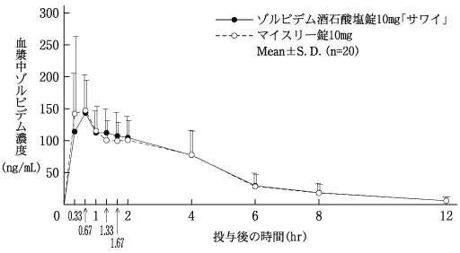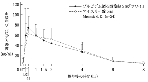 ゾルピデム酒石酸塩錠5mg「サワイ」とマイスリー錠5mgを健康成人男子にそれぞれ1錠(ゾルピデム酒石酸塩として5mg)空腹時単回経口投与(クロスオーバー法)し、血漿中ゾルピデム濃度を測定した。得られた薬物動態パラメータ(AUC、Cmax)について統計解析を行った結果、両剤の生物学的同等性が確認された2)。