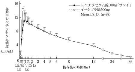 健康成人にレベチラセタム250、500、1000、1500、2000、3000、4000注1)、5000mg注1)(各投与量6例)を空腹時に単回経口投与したとき、すべての投与量でレベチラセタムの血漿中濃度は投与後ほぼ1時間に最高値を示し、消失半減期(t1/2)は投与量にかかわらず7~9時間であった3)。