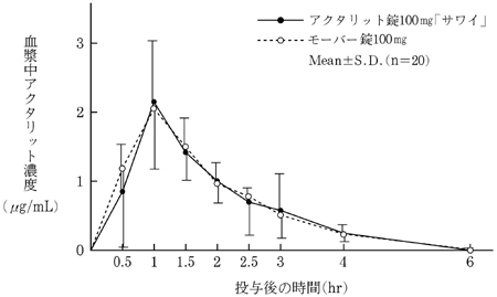 アクタリット錠100mg「サワイ」とモーバー錠100mgを健康成人男子にそれぞれ1錠(アクタリットとして100mg)空腹時単回経口投与(クロスオーバー法)し、血漿中アクタリット濃度を測定した。得られた薬物動態パラメータ(AUC、Cmax)について統計解析を行った結果、両剤の生物学的同等性が確認された2)。