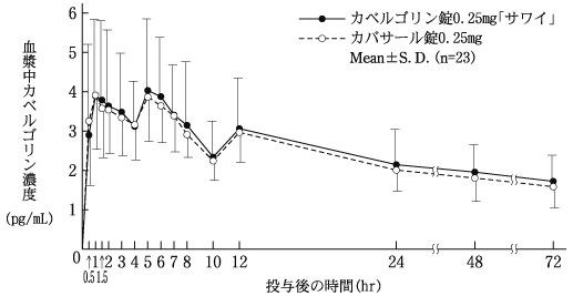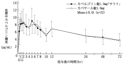 カベルゴリン錠1.0mg「サワイ」とカバサール錠1.0mgを健康成人男子にそれぞれ1錠(カベルゴリンとして1mg)空腹時単回経口投与(クロスオーバー法)し、血漿中カベルゴリン濃度を測定した。得られた薬物動態パラメータ(AUC、Cmax)について統計解析を行った結果、両剤の生物学的同等性が確認された2)。