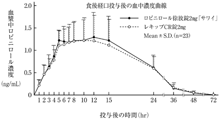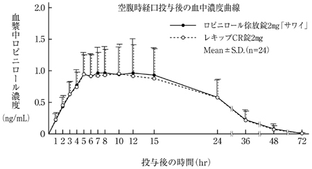 ロピニロール徐放錠2mg「サワイ」とレキップCR錠2mgを健康成人男子にそれぞれ1錠(ロピニロールとして2mg)空腹時及び食後単回経口投与(クロスオーバー法)し、血漿中ロピニロール濃度を測定した。得られた薬物動態パラメータ(AUC、Cmax)について90%信頼区間法にて統計解析を行った結果、log(0.80)~log(1.25)の範囲内であり、両剤の生物学的同等性が確認された2)。