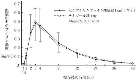 セチプチリンマレイン酸塩錠1mg「サワイ」とテシプール錠1mgを健康成人男子にそれぞれ1錠(セチプチリンマレイン酸塩として1mg)空腹時単回経口投与(クロスオーバー法)し、血漿中セチプチリン濃度を測定した。得られた薬物動態パラメータ(AUC、Cmax)について統計解析を行った結果、両剤の生物学的同等性が確認された2)。