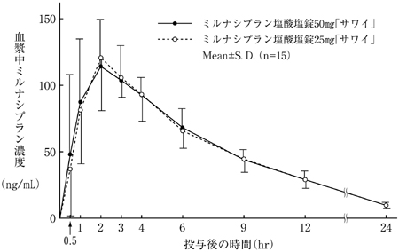 ミルナシプラン塩酸塩錠12.5mg「サワイ」は溶出挙動に基づき、ミルナシプラン塩酸塩錠25mg「サワイ」と生物学的に同等とみなされた9)。