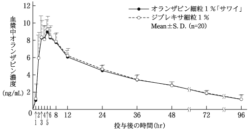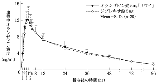 7) 血漿中濃度(健康成人)(ジプレキサ錠:2000年12月22日承認、申請資料概要ヘ.3.2.5, へ.3.2.7)