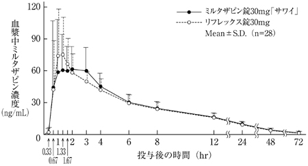 健康成人男性12例にシメチジン(CYP1A2、CYP2D6、CYP3A4等の阻害薬)1日2回800mgを5日間反復経口投与後ミルタザピン1日1回30mgを7日間反復経口投与で併用したところ、ミルタザピンのCmax及びAUC0-∞は単独投与時と比べてそれぞれ24%及び64%増加したが、半減期には有意な差は認められなかった。一方、シメチジンの薬物動態には併用による影響は認められなかった16)(外国人データ)。