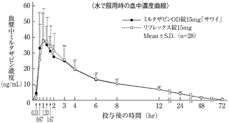 健康成人男性6例にミルタザピン1日1回30mgを7日間反復経口投与後、8日目にミルタザピン15mg単回経口投与後30分にエタノール60gを単回経口投与したところ、血漿中ミルタザピン濃度はエタノールの併用により高く推移する傾向が認められた。一方、エタノールの血漿中濃度推移はエタノール単独投与時と同様であったが、AUCはエタノール単独投与時と比較し低かった16)(外国人データ)。