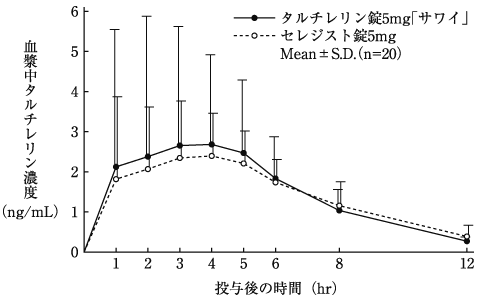 タルチレリン錠5mg「サワイ」とセレジスト錠5mgを健康成人男子にそれぞれ1錠(タルチレリン水和物として5mg)空腹時単回経口投与(クロスオーバー法)し、血漿中タルチレリン濃度を測定した。得られた薬物動態パラメータ(AUC、Cmax)について統計解析を行った結果、両剤の生物学的同等性が確認された3)。