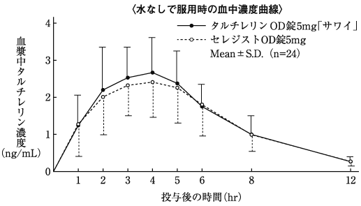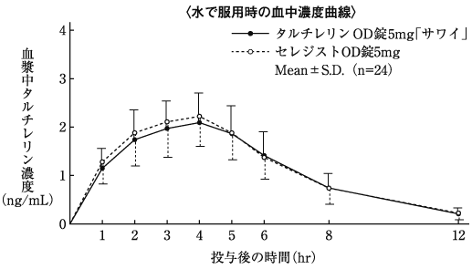 タルチレリンOD錠5mg「サワイ」とセレジストOD錠5mgを健康成人男子にそれぞれ1錠(タルチレリン水和物として5mg)空腹時単回経口投与(クロスオーバー法)し、血漿中タルチレリン濃度を測定した。得られた薬物動態パラメータ(AUC、Cmax)について90%信頼区間法にて統計解析を行った結果、log(0.80)~log(1.25)の範囲内であり、両剤の生物学的同等性が確認された4)。