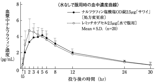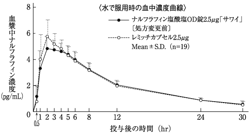通常、成人には、ナルフラフィン塩酸塩として1日1回2.5μgを夕食後又は就寝前に経口投与する。なお、症状に応じて増量することができるが、1日1回5μgを限度とする。