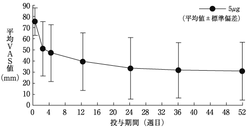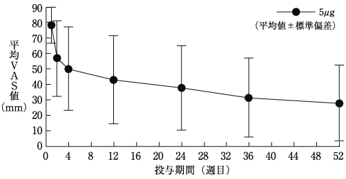 抗ヒスタミン薬又は抗アレルギー薬による治療が奏効しない難治性のそう痒症を有する慢性肝疾患患者注11)317例を対象に、1日1回、12週間経口反復投与した際の有効性を、かゆみの指標であるVASを用い、多施設二重盲検比較試験により検討した。主要評価項目は、投与期間4週目(LOCF)のVAS変化量とした。その結果、投与前後でのVAS変化量において、2.5μg及び5μg投与群で有効性が確認された20),21)。
