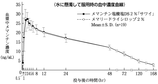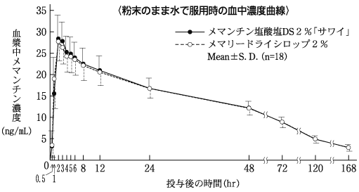 健康成人男性にメマンチン塩酸塩ドライシロップ1g(1g中にメマンチン塩酸塩を20mg含有、水に懸濁して服用又は粉末のまま水で服用)又はメマンチン塩酸塩錠20mg(水で服用)を空腹時単回経口投与したとき、いずれの服用方法でも両製剤の血漿中薬物動態パラメータは同様であること、並びに両製剤が生物学的に同等であることが確認された2)。