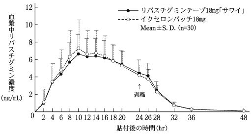 リバスチグミンテープ18mg「サワイ」とイクセロンパッチ18mgを健康成人男子にそれぞれ1枚(リバスチグミンとして18mg)単回経皮投与(貼付時間24時間)し、血漿中リバスチグミン濃度を測定した(クロスオーバー法)。得られた薬物動態パラメータ(AUC、Cmax)について90%信頼区間法にて統計解析を行った結果、log(0.80)〜log(1.25)の範囲内であり、両剤の生物学的同等性が確認された2)。