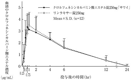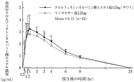 クロルフェネシンカルバミン酸エステル錠125mg「サワイ」とリンラキサー錠125mgを健康成人男子にそれぞれ2錠(クロルフェネシンカルバミン酸エステルとして250mg)空腹時単回経口投与(クロスオーバー法)し、血清中クロルフェネシンカルバミン酸エステル濃度を測定した。得られた薬物動態パラメータ(AUC、Cmax)について統計解析を行った結果、両剤の生物学的同等性が確認された2)。