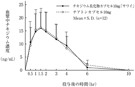 チキジウム臭化物カプセル10mg「サワイ」とチアトンカプセル10mgを健康成人男子にそれぞれ2カプセル(チキジウム臭化物として20mg注))空腹時単回経口投与(クロスオーバー法)し、血漿中チキジウム濃度を測定した。得られた薬物動態パラメータ(AUC、Cmax)について統計解析を行った結果、両剤の生物学的同等性が確認された2)。