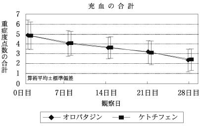 アレルギー性結膜炎患者(247例)を対象に、0.1%オロパタジン点眼液又は0.05%ケトチフェンフマル酸塩点眼液を両眼に1回2滴、1日4回(朝、昼、夕、就寝前)28日間点眼投与したところ、そう痒感及び充血の重症度点数において、0.1%オロパタジン点眼液は0.05%ケトチフェンフマル酸塩点眼液に劣らない有効性を示した。
