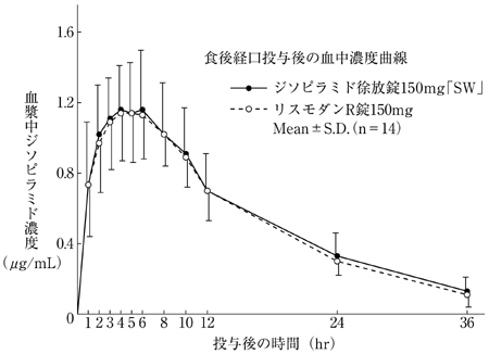 ジソピラミド徐放錠150mg「SW」とリスモダンR錠150mgを健康成人男子にそれぞれ1錠(ジソピラミドとして150mg)空腹時及び食後単回経口投与(クロスオーバー法)し、血漿中ジソピラミド濃度を測定した。得られた薬物動態パラメータ(AUC、Cmax)について統計解析を行った結果、両剤の生物学的同等性が確認された3)。