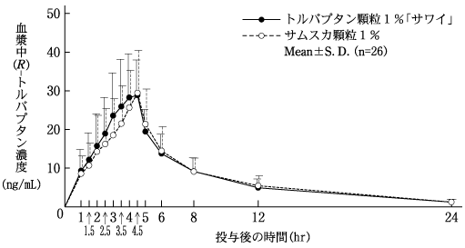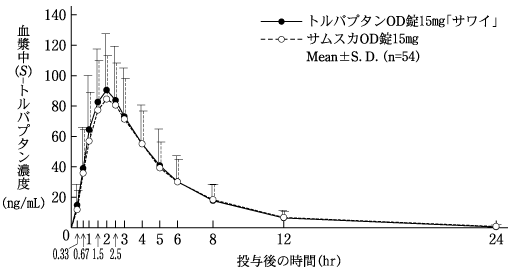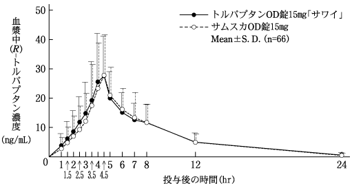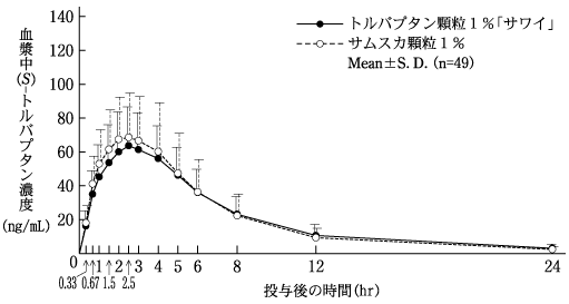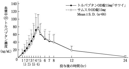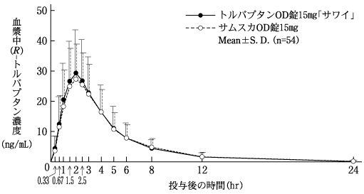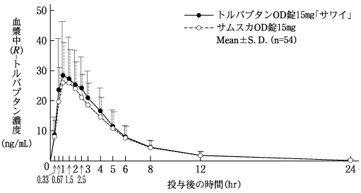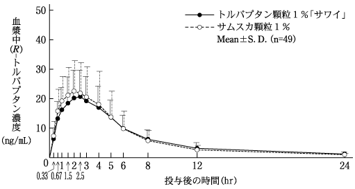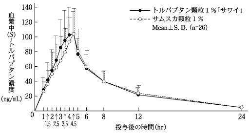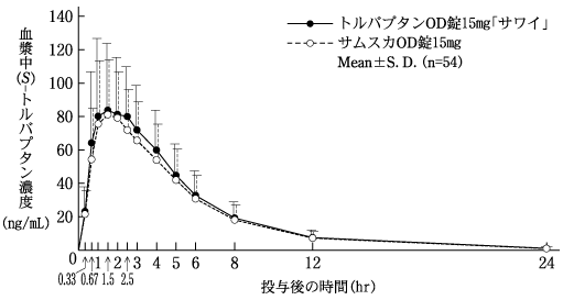 健康成人にトルバプタン15mgを単回経口投与した時、空腹時投与に比べ食後投与ではCmax及びAUCはそれぞれ1.3倍及び1.1倍であった4)。