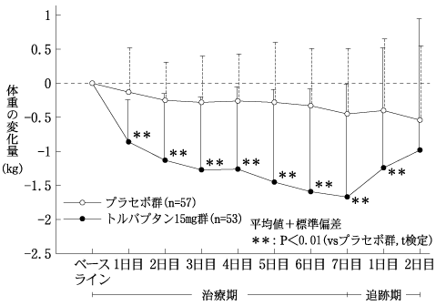 他の利尿薬を投与しても体液貯留が認められるうっ血性心不全患者を対象とした二重盲検比較試験において、トルバプタン15mg又はプラセボを1日1回7日間経口投与した。主要評価項目である最終投与時の体重変化量は、トルバプタン15mg群-1.54±1.61kg(ベースライン:59.42±12.30kg、53例)(平均値±標準偏差、以下同様)、プラセボ群-0.45±0.93kg(ベースライン:55.68±12.60kg、57例)であり、トルバプタン群では、プラセボ群に比較して有意な体重減少が認められた(p<0.0001、t検定)。体重減少は投与翌日よりみられ投与期間を通じて継続した(図17-1)。また、最終投与時における心性浮腫に伴う所見(頚静脈怒張、肝腫大、下肢浮腫)が改善した(表17-1)。