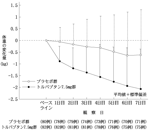 他の利尿薬を投与しても体液貯留が認められる肝硬変患者を対象とした二重盲検比較試験において、トルバプタン7.5mg又はプラセボを1日1回7日間経口投与した。主要評価項目である最終投与時の体重変化量は、トルバプタン7.5mg群-1.95±1.77kg(ベースライン:59.35±12.69kg、82例)(平均値±標準偏差、以下同様)、プラセボ群-0.44±1.93kg(ベースライン:59.15±13.15kg、80例)であり、トルバプタン群では、プラセボ群に比較して有意な体重減少が認められた(p<0.0001、t検定)。体重減少は投与翌日よりみられ投与期間を通じて継続した(図17-2)。最終投与時における肝性浮腫に伴う所見(腹水量、腹囲、下肢浮腫)が改善した(表17-2)。また、臨床症状(腹部膨満感、倦怠感、臥位での圧迫感、呼吸困難感、全身状態)も改善した。