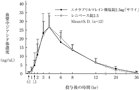 エナラプリルマレイン酸塩錠2.5mg「サワイ」とレニベース錠2.5を健康成人男子にそれぞれ2錠(エナラプリルマレイン酸塩として5mg)空腹時単回経口投与(クロスオーバー法)し、活性代謝物であるジアシド体の血漿中濃度を測定した。得られた薬物動態パラメータ(AUC、Cmax)について統計解析を行った結果、両剤の生物学的同等性が確認された5)。