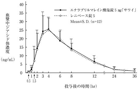 エナラプリルマレイン酸塩錠5mg「サワイ」とレニベース錠5を健康成人男子にそれぞれ1錠(エナラプリルマレイン酸塩として5mg)空腹時単回経口投与(クロスオーバー法)し、活性代謝物であるジアシド体の血漿中濃度を測定した。得られた薬物動態パラメータ(AUC、Cmax)について統計解析を行った結果、両剤の生物学的同等性が確認された6)。