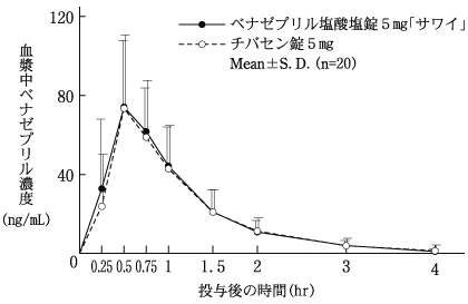 ベナゼプリル塩酸塩錠5mg「サワイ」とチバセン錠5mgを健康成人男子にそれぞれ1錠(ベナゼプリル塩酸塩として5mg)空腹時単回経口投与(クロスオーバー法)し、血漿中ベナゼプリル濃度を測定した。得られた薬物動態パラメータ(AUC、Cmax)について統計解析を行った結果、両剤の生物学的同等性が確認された3)。