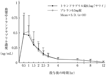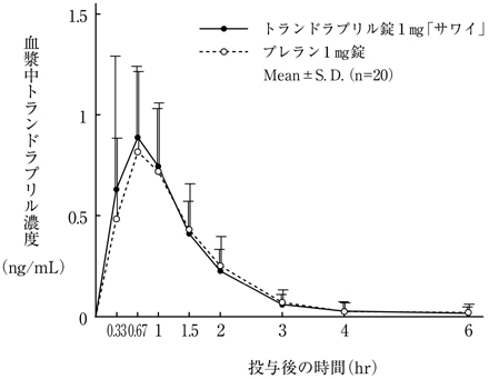 トランドラプリル錠1mg「サワイ」とプレラン1mg錠を健康成人男子にそれぞれ1錠(トランドラプリルとして1mg)空腹時単回経口投与(クロスオーバー法)し、血漿中トランドラプリル濃度を測定した。得られた薬物動態パラメータ(AUC、Cmax)について統計解析を行った結果、両剤の生物学的同等性が確認された6)。