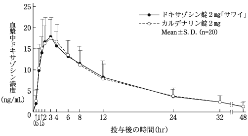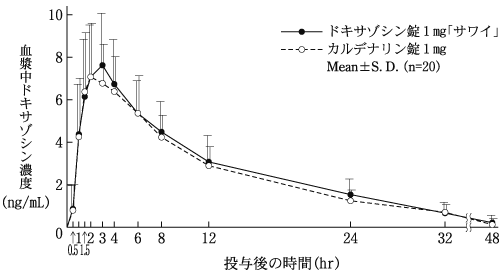 ドキサゾシン錠2mg「サワイ」とカルデナリン錠2mgを健康成人男子にそれぞれ1錠(ドキサゾシンメシル酸塩をドキサゾシンとして2mg)空腹時単回経口投与(クロスオーバー法)し、血漿中ドキサゾシン濃度を測定した。得られた薬物動態パラメータ(AUC、Cmax)について統計解析を行った結果、両剤の生物学的同等性が確認された7)。