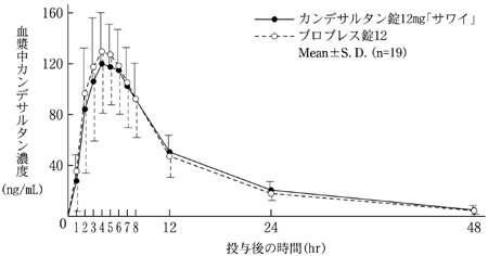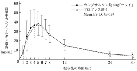 カンデサルタンOD錠2mg「サワイ」は溶出挙動に基づき、カンデサルタンOD錠4mg「サワイ」と生物学的に同等とみなされた14) 。