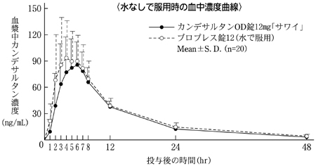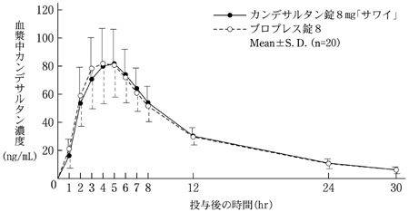 カンデサルタンOD錠8mg「サワイ」は溶出挙動に基づき、カンデサルタンOD錠4mg「サワイ」と生物学的に同等とみなされた15) 。