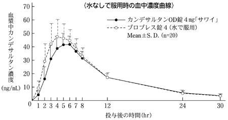 本態性高血圧症患者8例(38~68歳)に、1日1回4mgを朝食後に初回投与し、さらに1日休薬後連日7日間反復投与した時、いずれも血中には活性代謝物のカンデサルタン及び非活性代謝物M-Ⅱが検出されるが、未変化体はほとんど検出されない。1日目(初回投与後)及び9日目(7日間反復投与後)のカンデサルタンの血中濃度は、投与4~6時間後にピークに達した後、徐々に低下する4)。