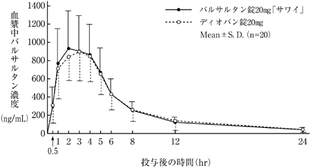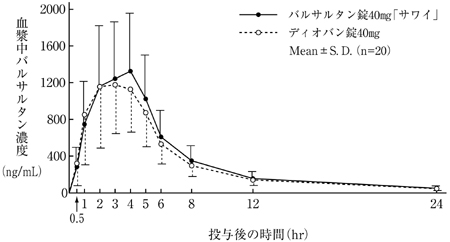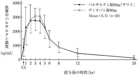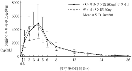 バルサルタン錠160mg「サワイ」とディオバン錠160mgを健康成人男子にそれぞれ1錠(バルサルタンとして160mg)空腹時単回経口投与(クロスオーバー法)し、血漿中バルサルタン濃度を測定した。得られた薬物動態パラメータ(AUC、Cmax)について統計解析を行った結果、両剤の生物学的同等性が確認された9)。