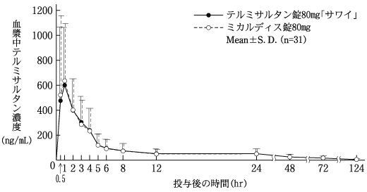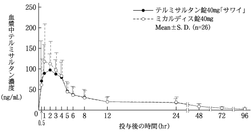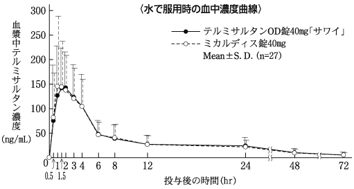 テルミサルタンOD錠40mg「サワイ」(水なし又は水で服用)とミカルディス錠40mg(水で服用)を健康成人男子にそれぞれ1錠(テルミサルタンとして40mg)空腹時単回経口投与(クロスオーバー法)し、血漿中テルミサルタン濃度を測定した。得られた薬物動態パラメータ(AUC、Cmax)について90%信頼区間法にて統計解析を行った結果、log(0.80)~log(1.25)の範囲内であり、両剤の生物学的同等性が確認された13)。
